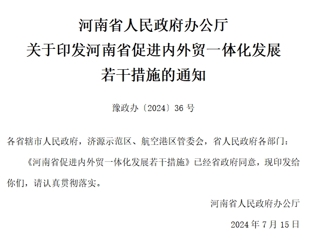 河南省人民政府辦公廳 關于印發河南省促進內外貿一體化發展 若